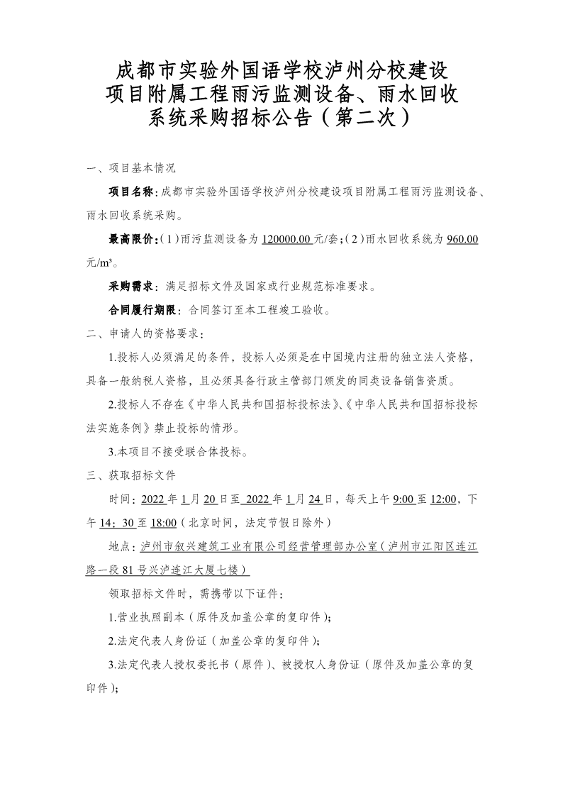 成都市實驗外國語學校瀘州分校建設項目附屬工程雨污監(jiān)測設備、雨水回收系統(tǒng)采購招標公告(第二次) 作者: 來源: 日期:2022-01-19 瀏覽次數(shù): 次 【字體:小 大】 【打印正文】