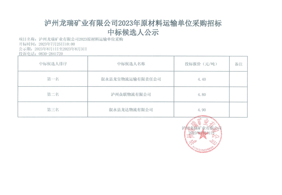 瀘州龍瑞礦業(yè)有限公司2023年原材料運(yùn)輸單位采購(gòu)招標(biāo)中標(biāo)候選人公示 作者: 來源: 日期:2023-07-31 瀏覽次數(shù): 次 【字體:小 大】 【打印正文】