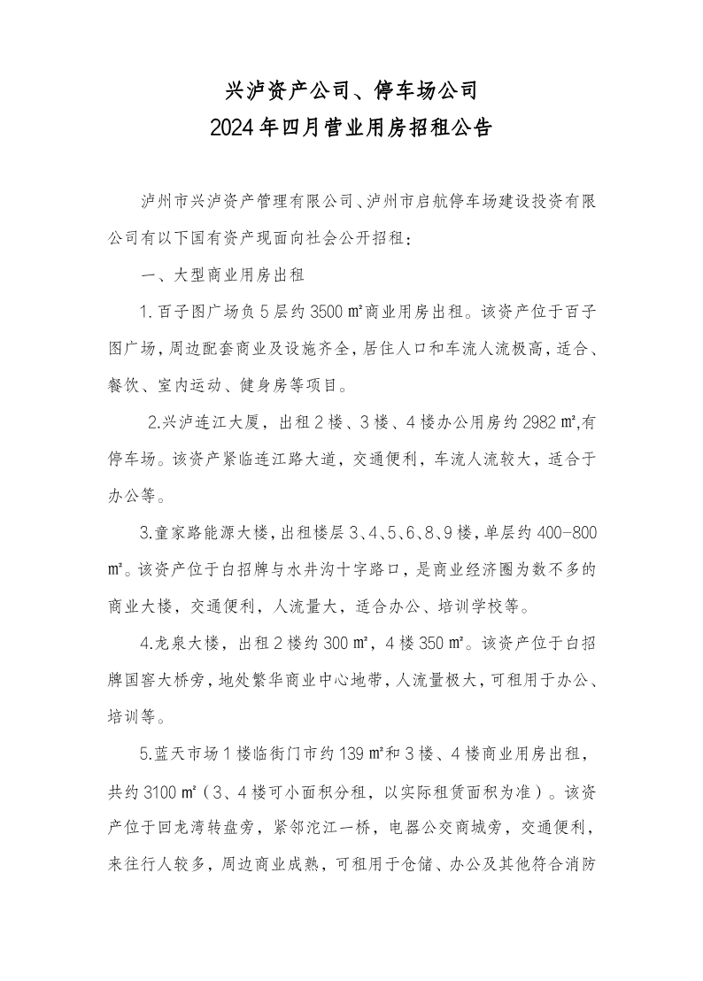 興瀘資產(chǎn)公司、停車場(chǎng)公司2024年四月營(yíng)業(yè)用房招租公告 作者: 來(lái)源: 日期:2024-04-15 瀏覽次數(shù): 次 【字體:小 大】 【打印正文】