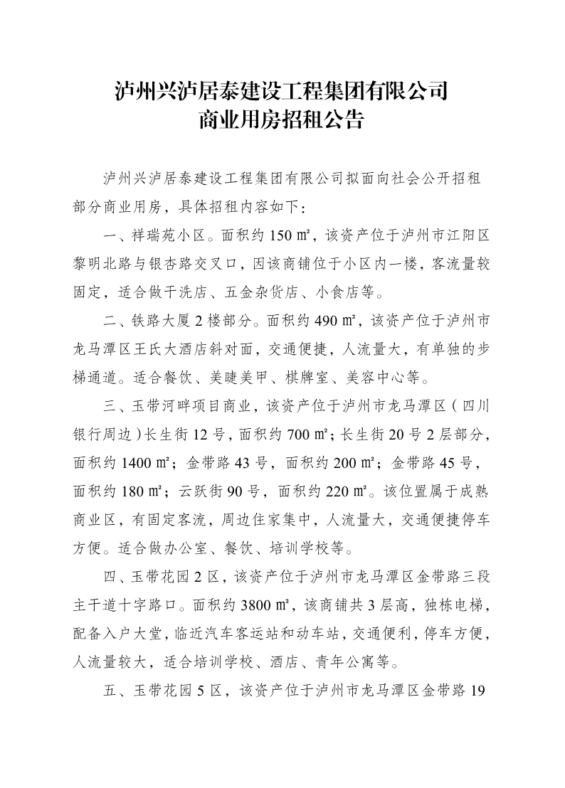 瀘州興瀘居泰建設(shè)工程集團(tuán)有限公司商業(yè)用房招租公告